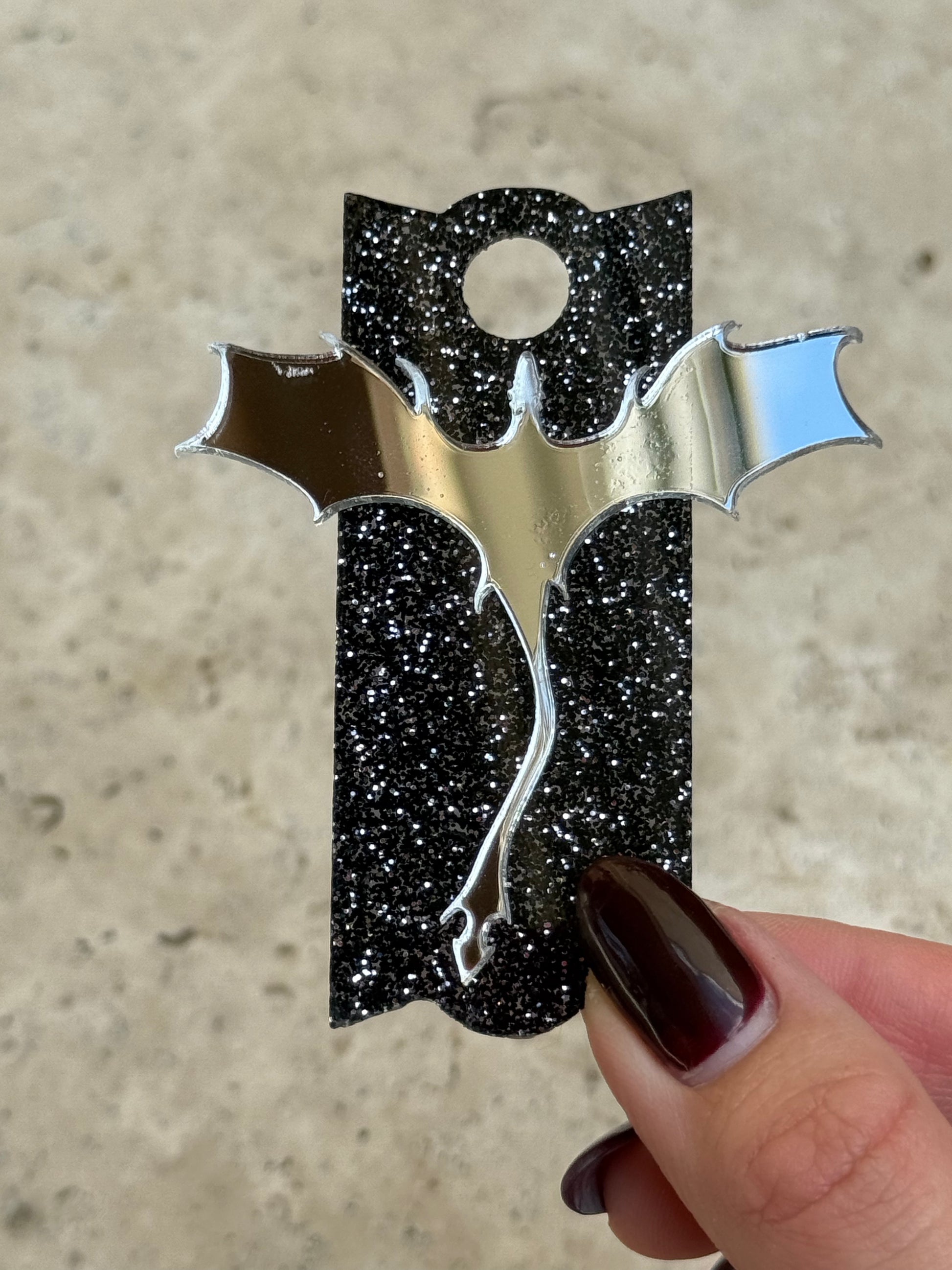 Features an epic dragon silhouette with a sleek black glitter base and striking silver mirrored acrylic accents