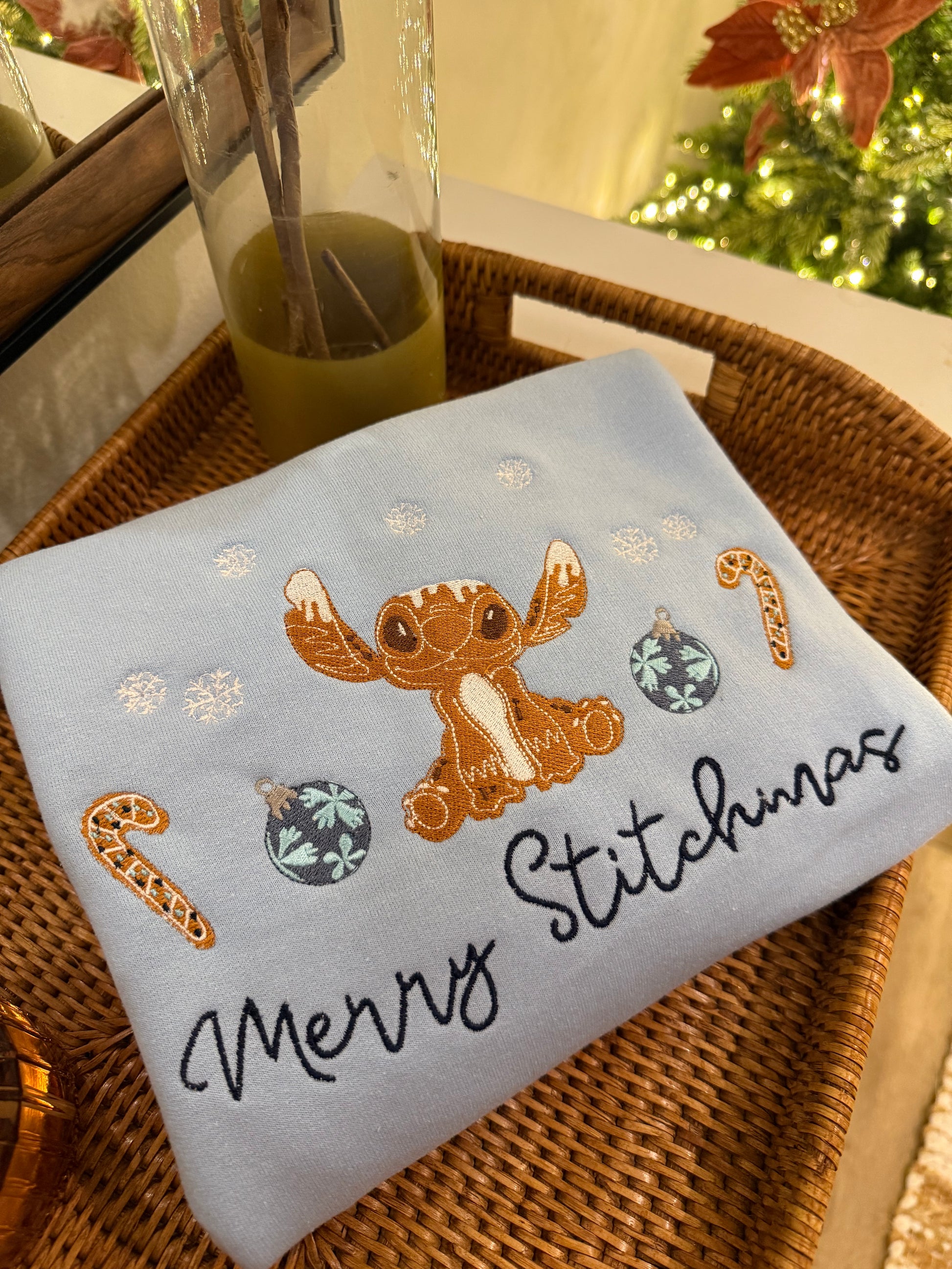 Get cozy this holiday season with our light blue Merry Stitchmas sweatshirt, featuring an exclusive embroidered Gingerbread Stitch design that captures the sweetest side of the season! This one-of-a-kind piece combines Disney magic with festive charm — perfect for Disney lovers, holiday parties, or lounging in holiday style.