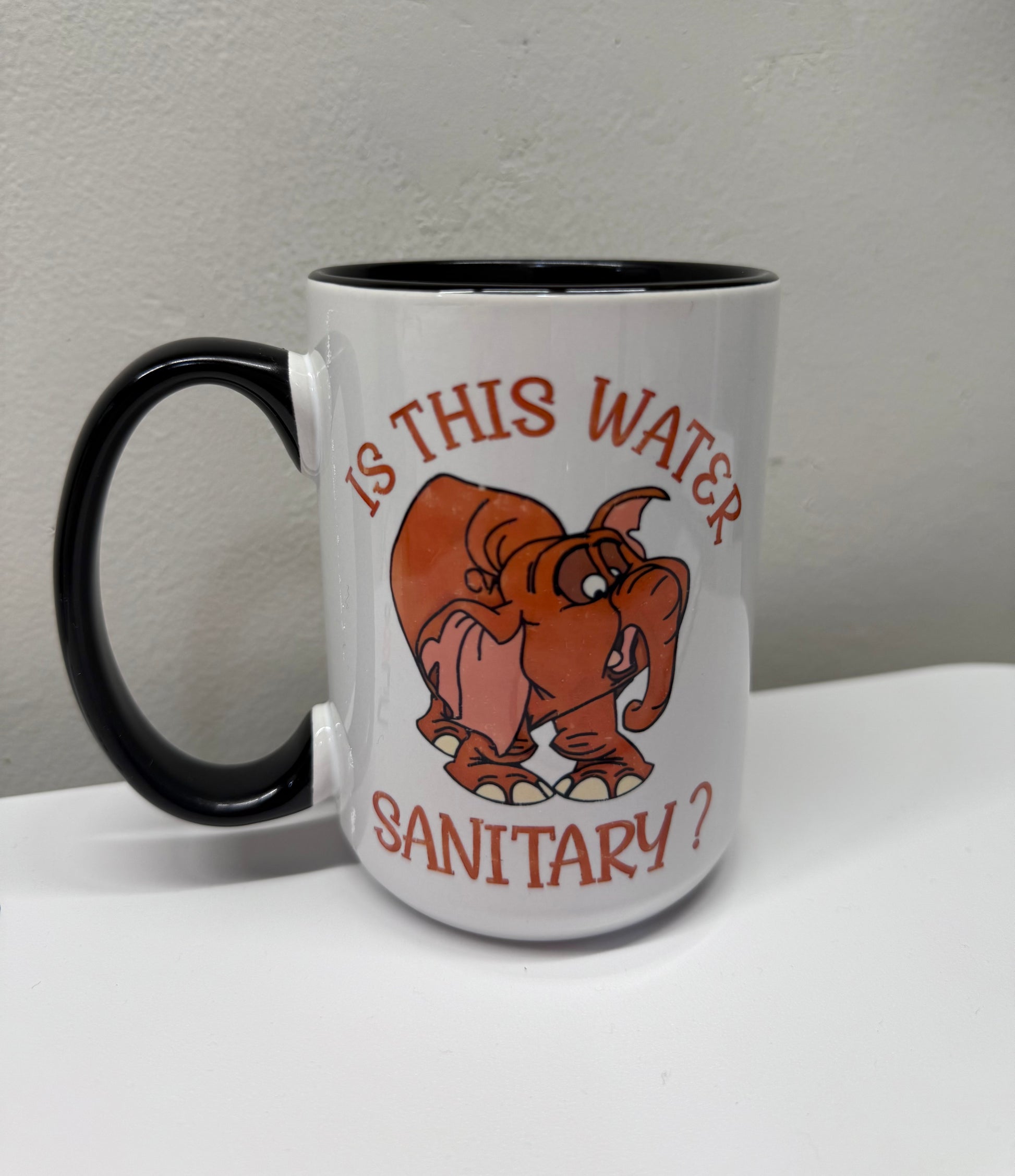 Bring a touch of adventure to your daily routine with this striking 16oz double-colored mug, featuring a bold white exterior and deep-black interior for a clean, modern contrast. The highlight of the design is a charming jungle-inspired “water-sanitary” elephant illustration, reminiscent of the playful, gentle elephants often found in classic adventure tales.