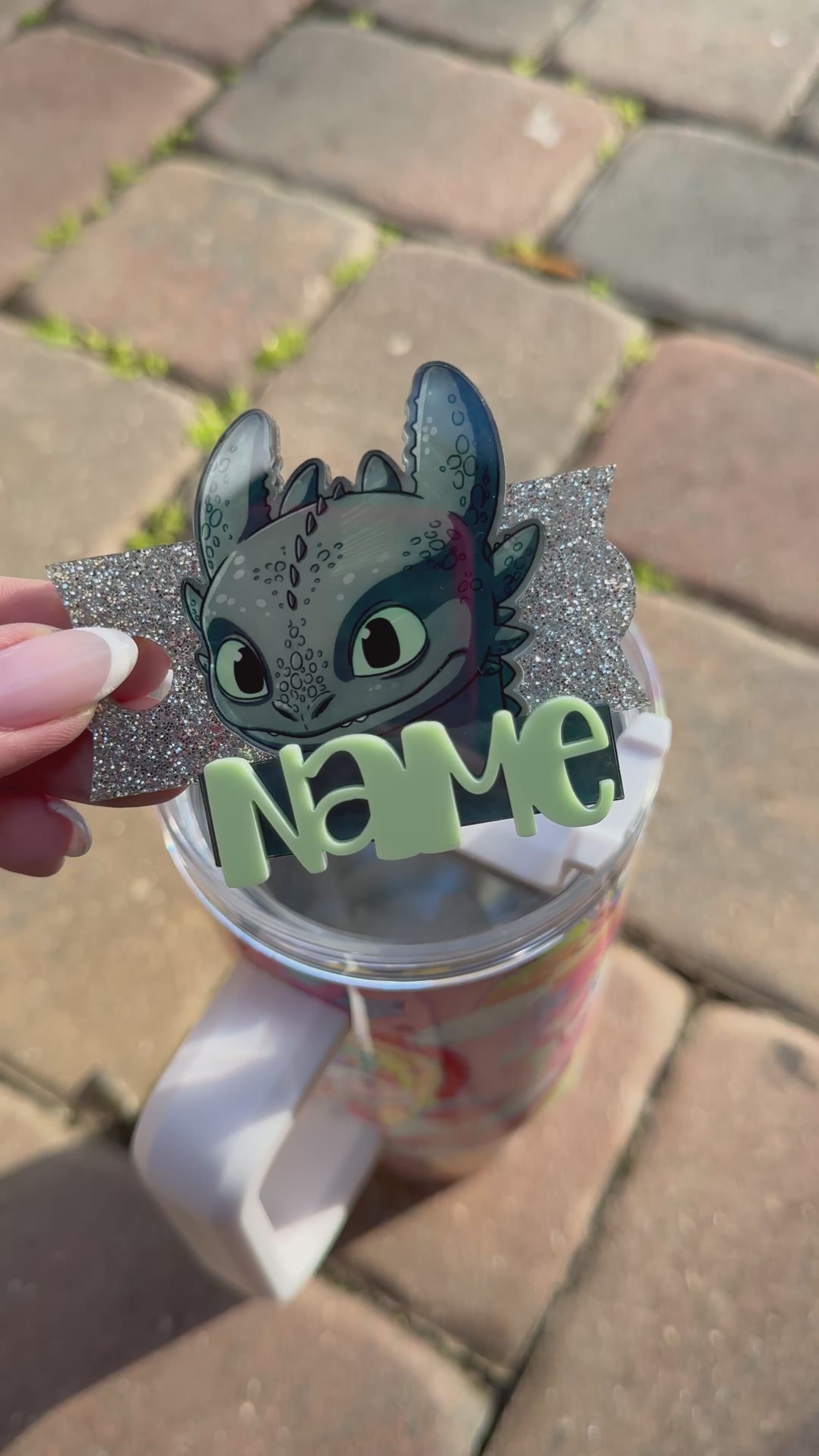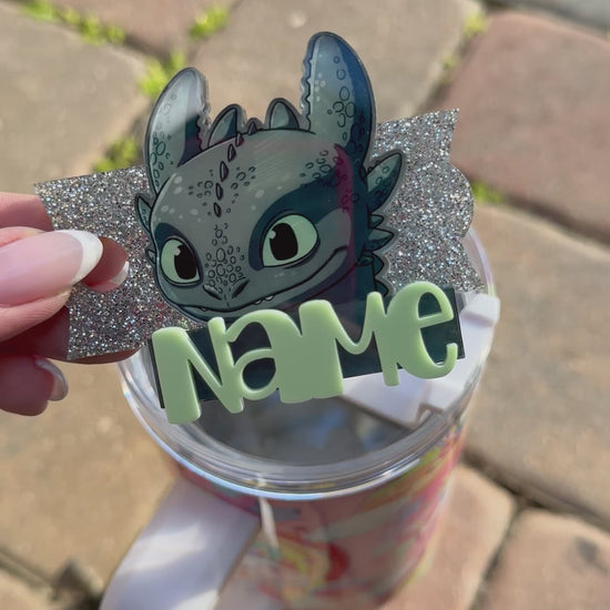 This Toothless–inspired acrylic tumbler topper is the perfect finishing touch for your favorite cup. Designed with a playful, night-fury vibe and personalized with your name, it adds personality while helping keep your drink protected from dust and spills.